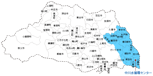 | 中川水循環センターは常磐道・首都高・外環道を接続している「三郷ジャンクション」のすぐそばにあります。 埼玉県東部の11市4町(さいたま市、川口市、春日部市、草加市、越谷市、八潮市、三郷市、蓮田市、幸手市、吉川市、白岡市、伊奈町、宮代町、杉戸町、松伏町)から流れてくる下水を処理しています。 敷地面積は59.7haで、東京ディズニーランドの約1.2倍の広さです。 その敷地内に水処理9系列及び汚泥焼却炉4基を有し、一日平均約45万m³の下水を処理しています。 |