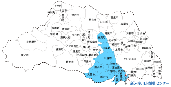 | 荒川右岸流域下水道は、荒川の右岸にある10市3町を処理対象とした下水道です。 川越市・所沢市・狭山市・入間市・朝霞市・志木市・和光市・新座市・富士見市・ふじみ野市・三芳町・川島町・吉見町が該当します。 |